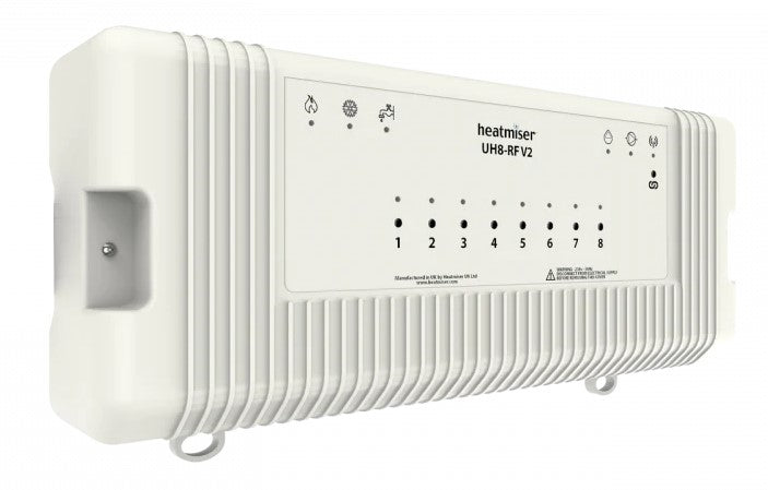 A software option is the thermostat allows you to configure which zones are underfloor heating and which zones are radiators. Radiator zones will not enable the underfloor heating pump and valve when there is a call for heat. In addition, the UH8-RF offers DIN Rail Mounting and the enclosure has been designed so that you no longer need to drill cut outs for cable entry.